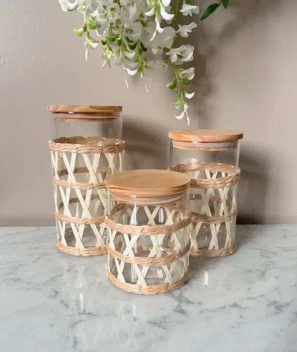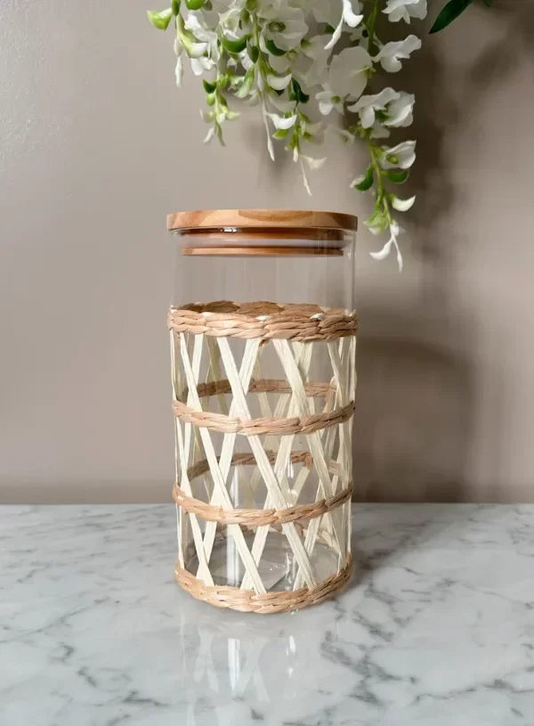 Frasco organizador de vidrio con tapa de madera con entrelazado de fibra natural