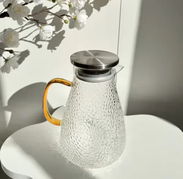 Jarra de vidrio granulado con tapa de acero y mando dorado