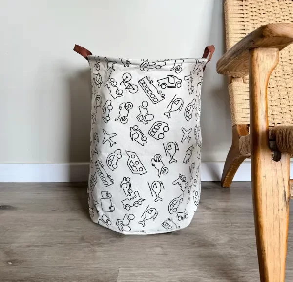 Canasto de tela blanco impreso con manchas en negro y asas de cuerina marrón 40x50cm